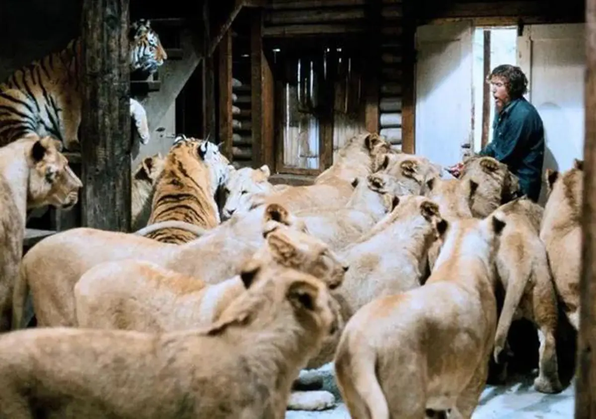上世纪60年代好莱坞明星蒂比·海德莉养了只狮子叫Neil,照片上看着挺温馨,实际上过得提心吊胆:不能摸脸、不能乱跑、更不能背对着它。就这么小心,Neil还是差点把驯兽师给咬死。后来海德莉自己都说猛兽终归是猛兽,再养也变不成猫。
